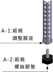 | <B>深度橫桿組合: | A-1,將 腳座 置入立柱底部 使用螺絲固定完成。 A-2,將 腳墊 置入腳座底部 完成 腳座組裝。 |