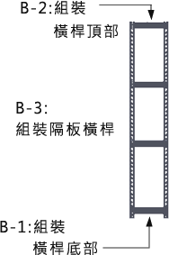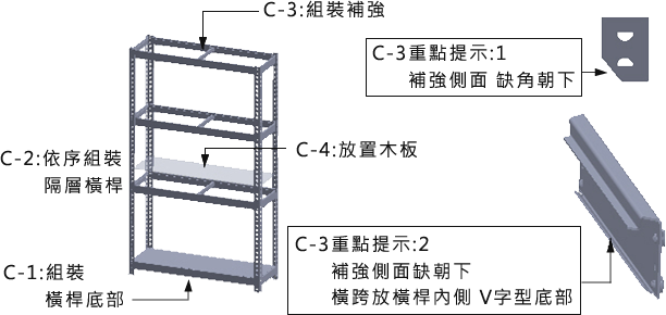 | <C>寬度橫桿組合: | C-1,先組裝底部橫桿。 C-2,再依序往上組裝隔層橫桿至左右兩面 完成 腳座組裝。 C-3,再將 補牆側面缺腳朝下再以橫躺方式跨在左右寬度橫桿內側V字型底部 然後朝補牆缺角方向旋轉半圓卡住左右寬度橫桿 完成補強組裝。 C-4,將 木板置放 於 橫桿內中間 完成 層板組裝。 |
